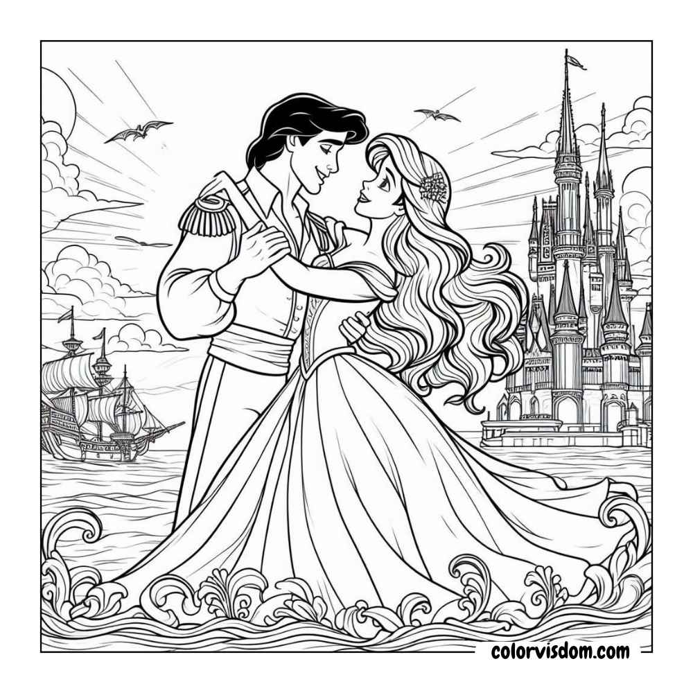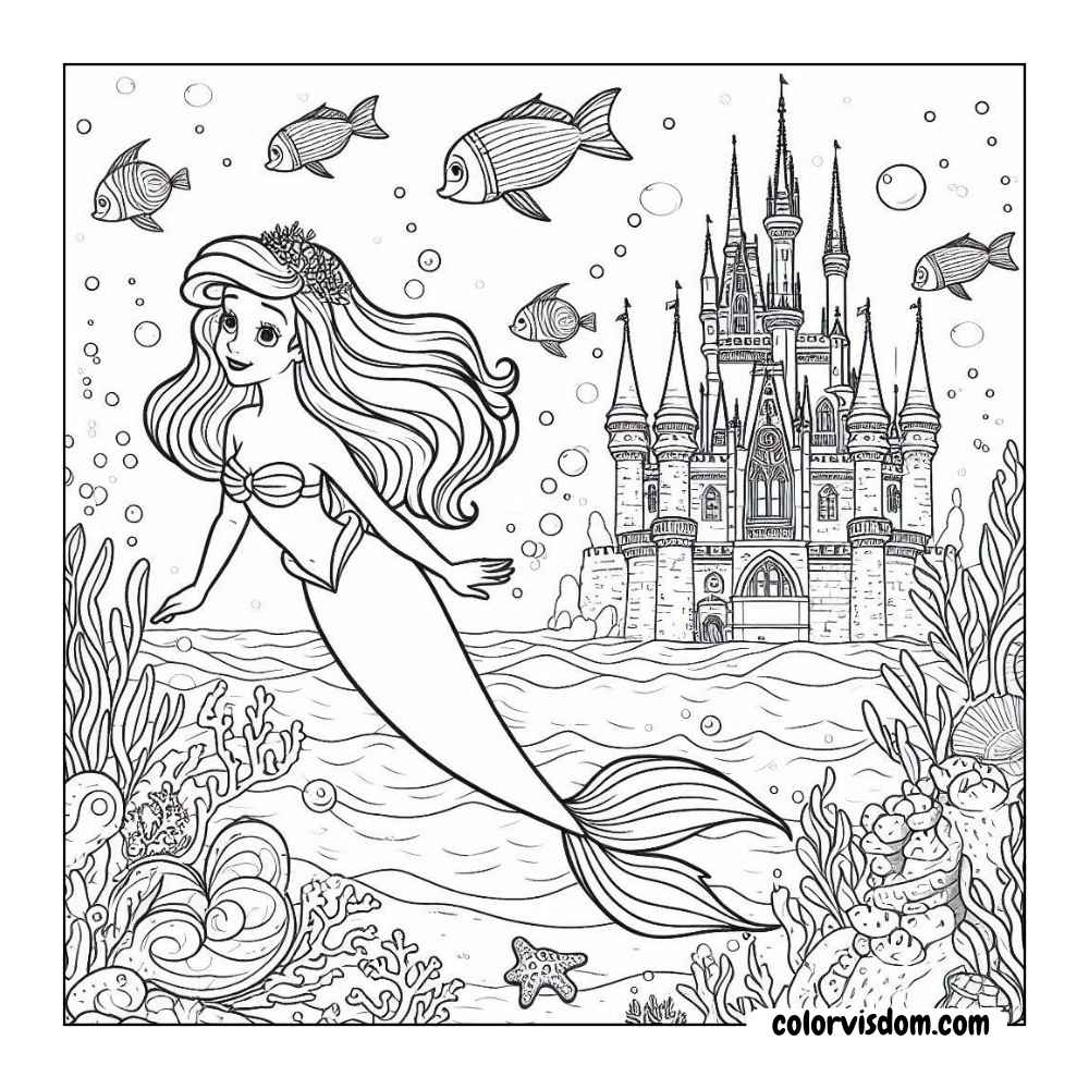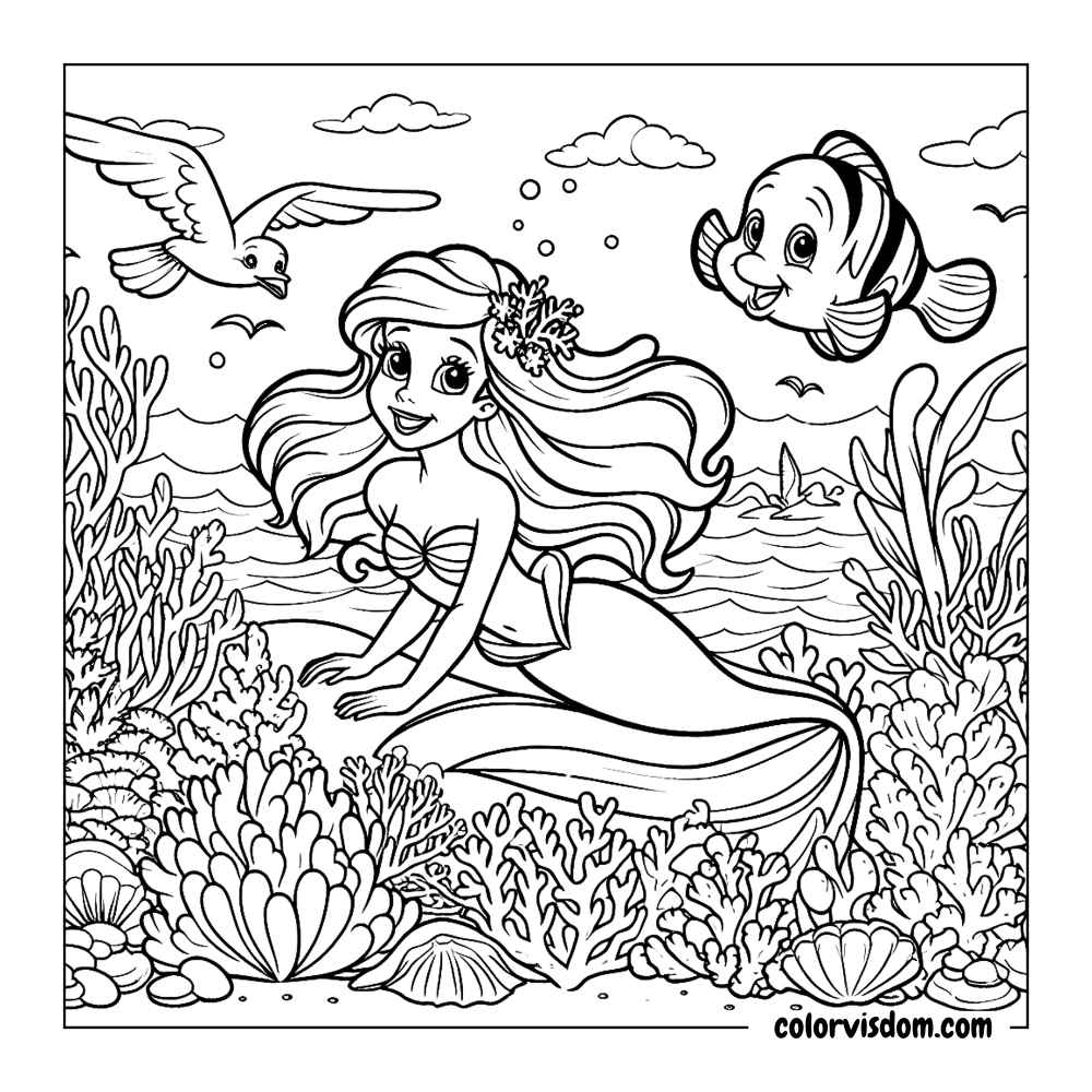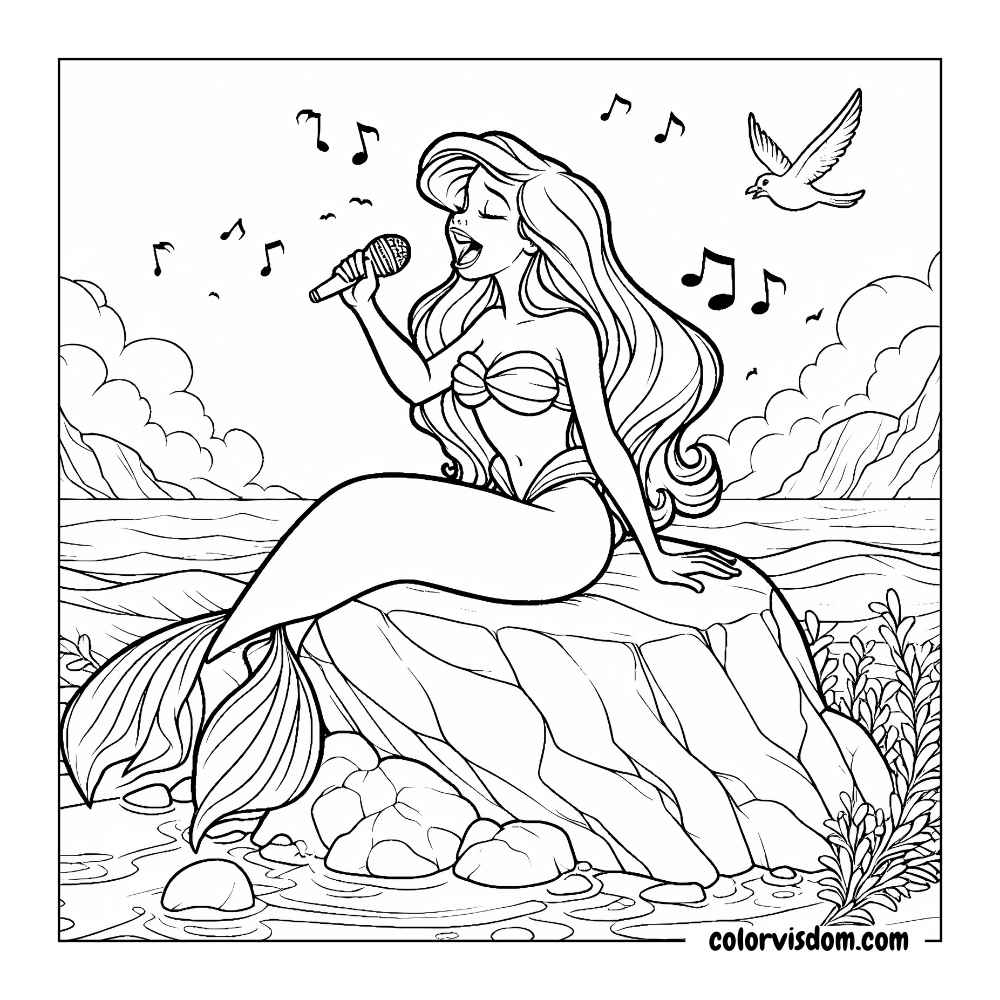 One of the most iconic scenes features Ariel sitting on a rock, singing her heart out with waves crashing behind her and seagulls soaring overhead. This coloring page captures the beauty and freedom of Ariel’s voice, making it a favorite for kids and adults alike.