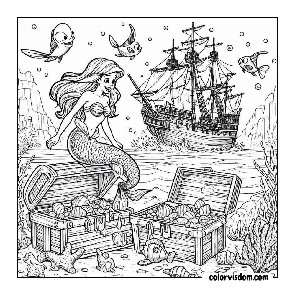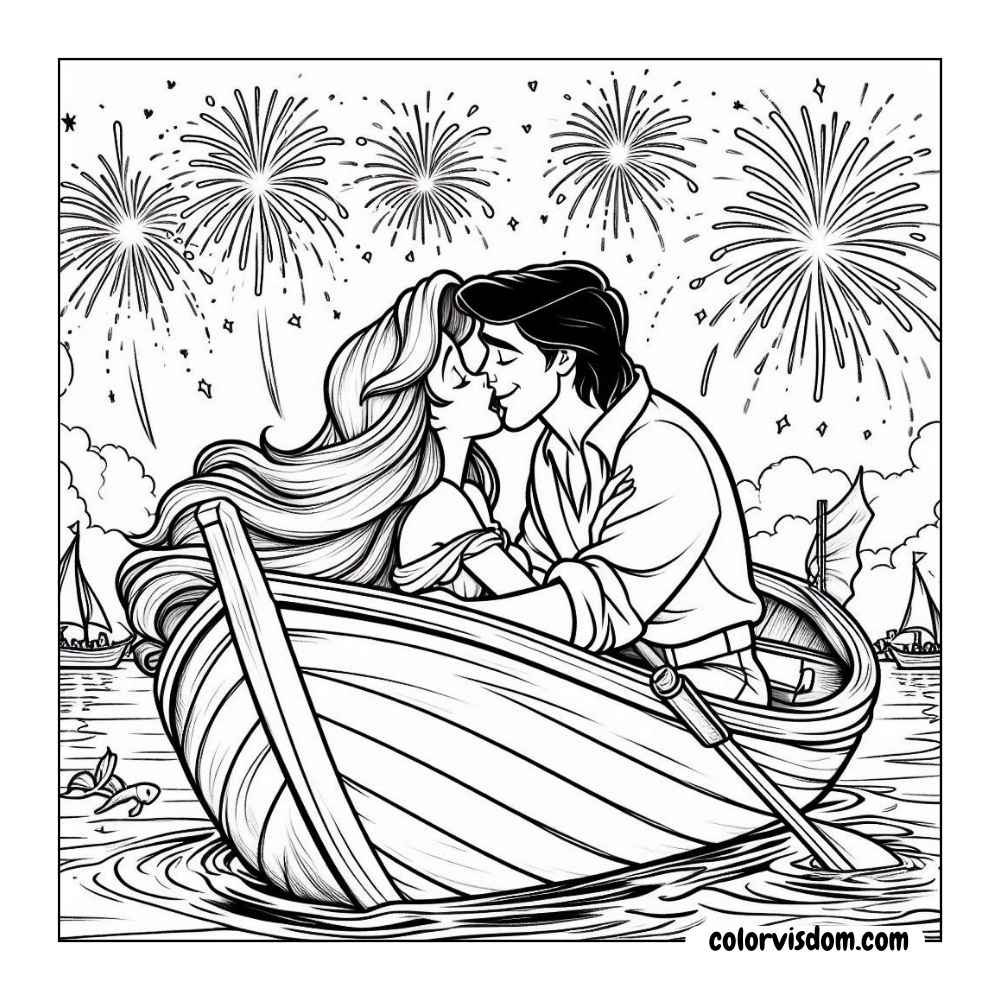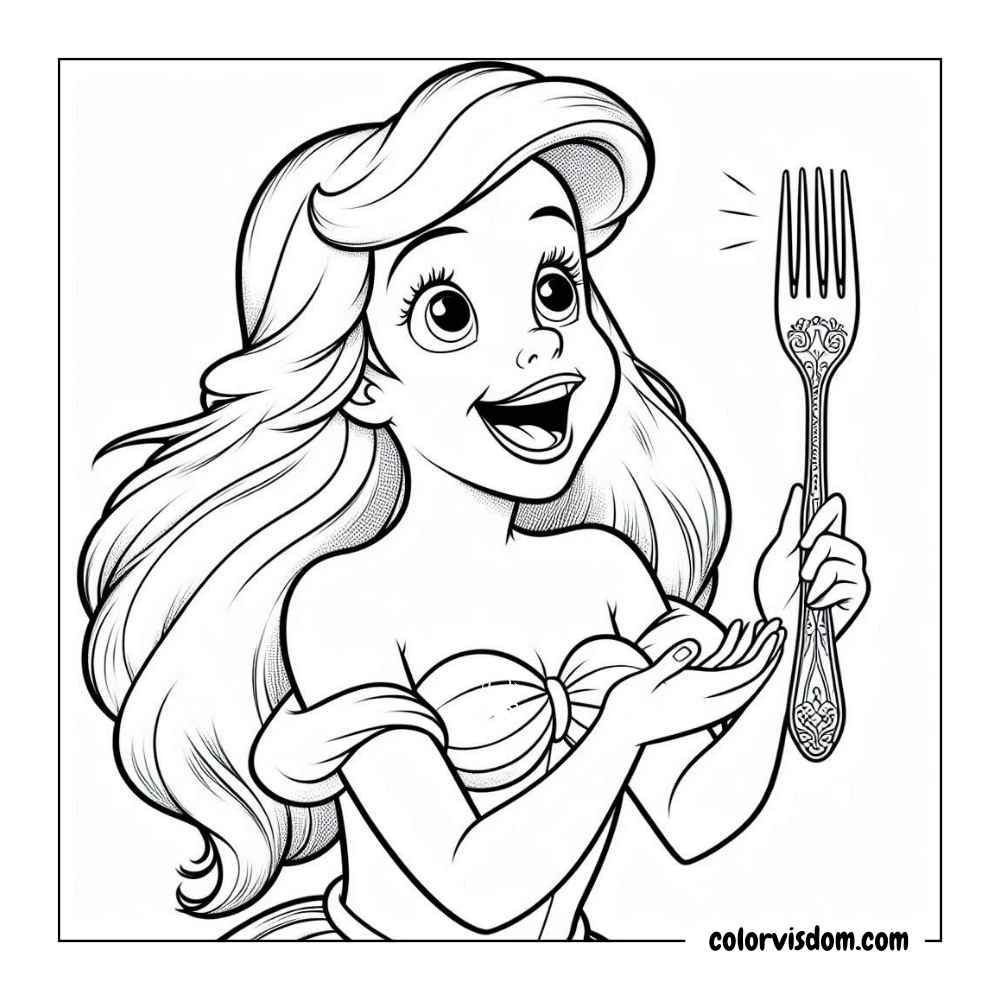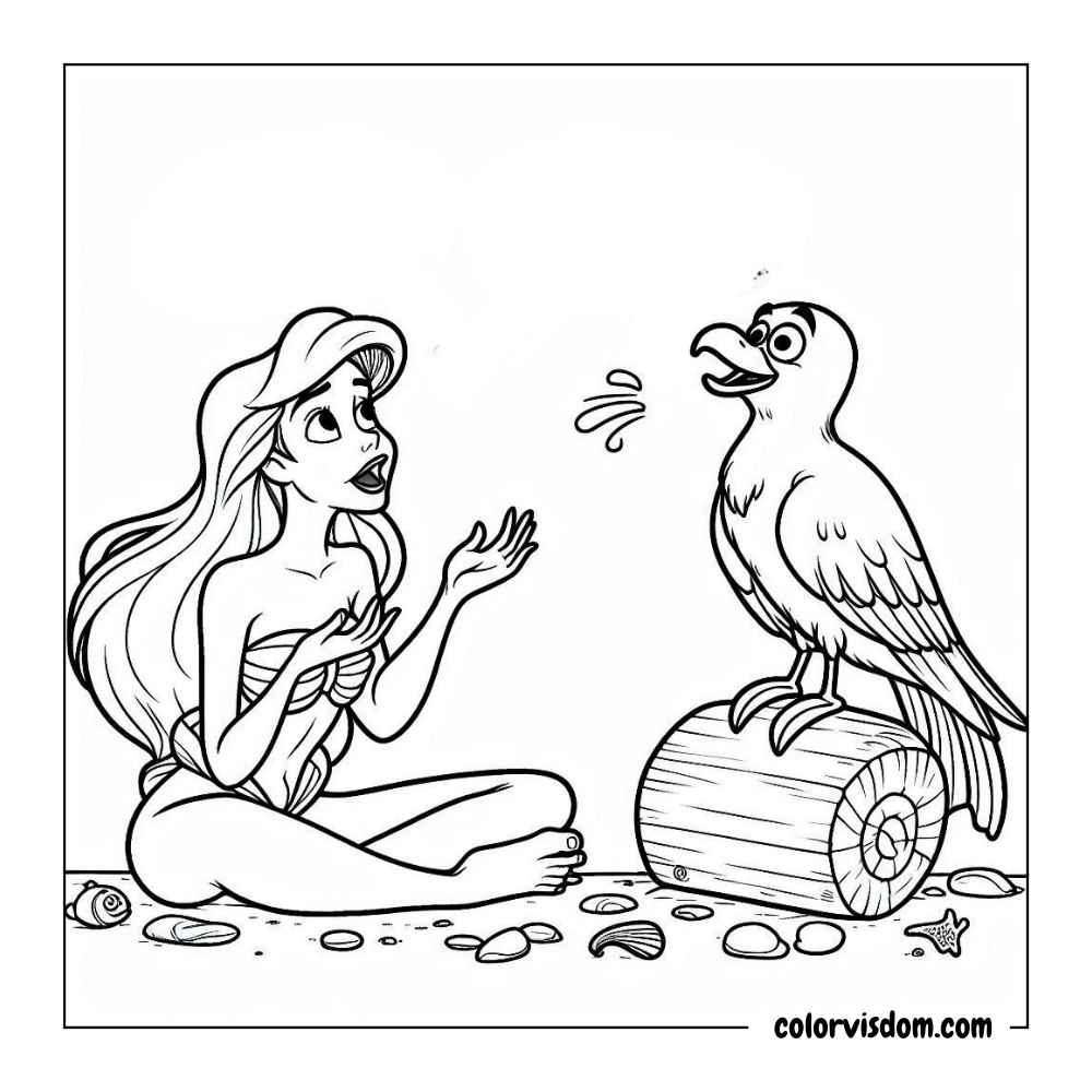 One of the most iconic scenes features Ariel sitting on a rock, singing her heart out with waves crashing behind her and seagulls soaring overhead. This coloring page captures the beauty and freedom of Ariel’s voice, making it a favorite for kids and adults alike.
